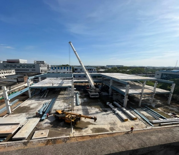 This is the regular type of steel structure with RCC foundations, steel columns, primary and secondary steel beams connections in the main frames and Corrugated metal floor deck on the steel beams with concrete. This type of structure we can prefer in all type of buildings like multi storied commercial and residential, Industrial Buildings, Mezzanine floors, Multi-level car parking etc.